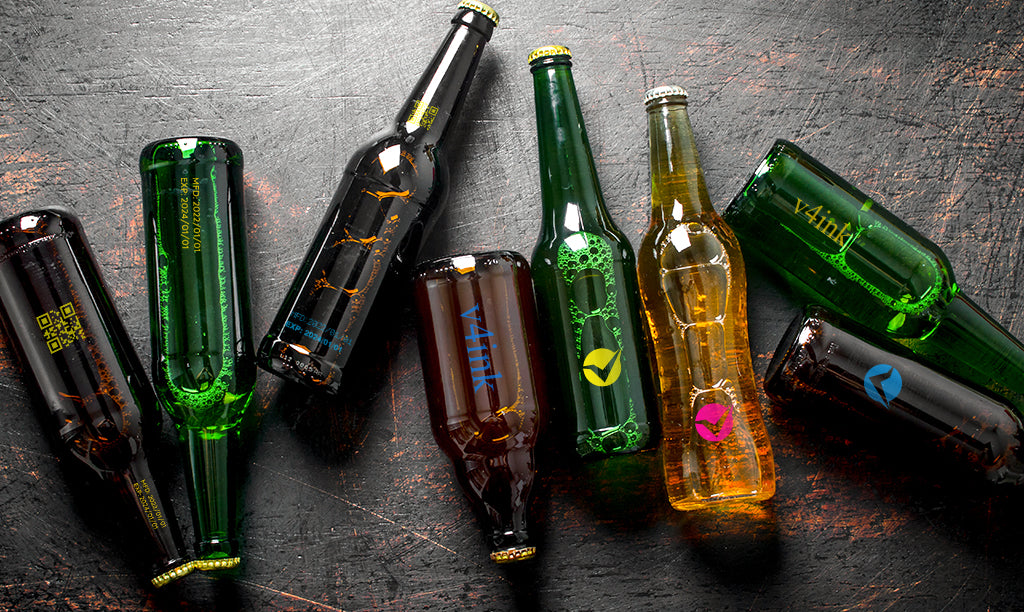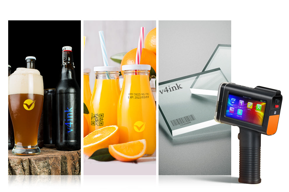 v4ink solvent-based handheld printer with fast-dry ink cartridges can easily print text, logos, pictures, date, barcode, QR code, etc. on glass bottles, glass table and other glass materials, showing clear and bright printing results. It is a great partner for printing on glass with you.